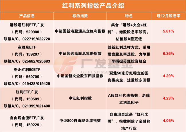 广发基金布局了丰富的红利产品线,覆盖A股、港股及不同策略红利资产,不同红利指数各具特色,为投资者提供便捷配置工具。