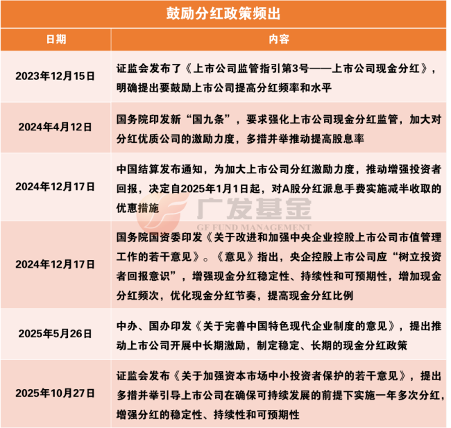 近年来,多个鼓励分红政策连续发布,旨在多措并举推动提高股息率。例如,2024年新“国九条”明确要求“强化上市公司现金分红监管”。在政策大力支持下,上市公司分红水平有望进一步提升。