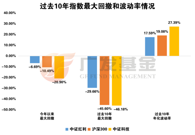 红利资产在震荡市中的价值凸显。其最大特征之一是相对于其他板块的低波动性。今年以来,中证红利指数的最大回撤仅为-6.69%,较沪深300指数(-10.49%)收窄4个百分点,显著低于中证科技指数(-20.90%)的水平。中证红利指数过去10年的年化波动率为17.59%,也低于市场平均水平,展现出良好的防守属性,虽然进攻弹性可能低于科技板块,但能平滑市场整体波动。