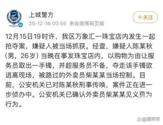 在杭州警方为柴振鹏申报见义勇为表彰时,这个00后小伙子只是腼腆地说:“当时就想着不能让他跑了,毕竟我天天在这片送餐。”这种将英勇行为视作分内之事的平常心,或许正是对“侠之大者,为国为民”最朴素的诠释。正如网友的热评:“他们送的是外卖,守护的却是整座城市的温度。”