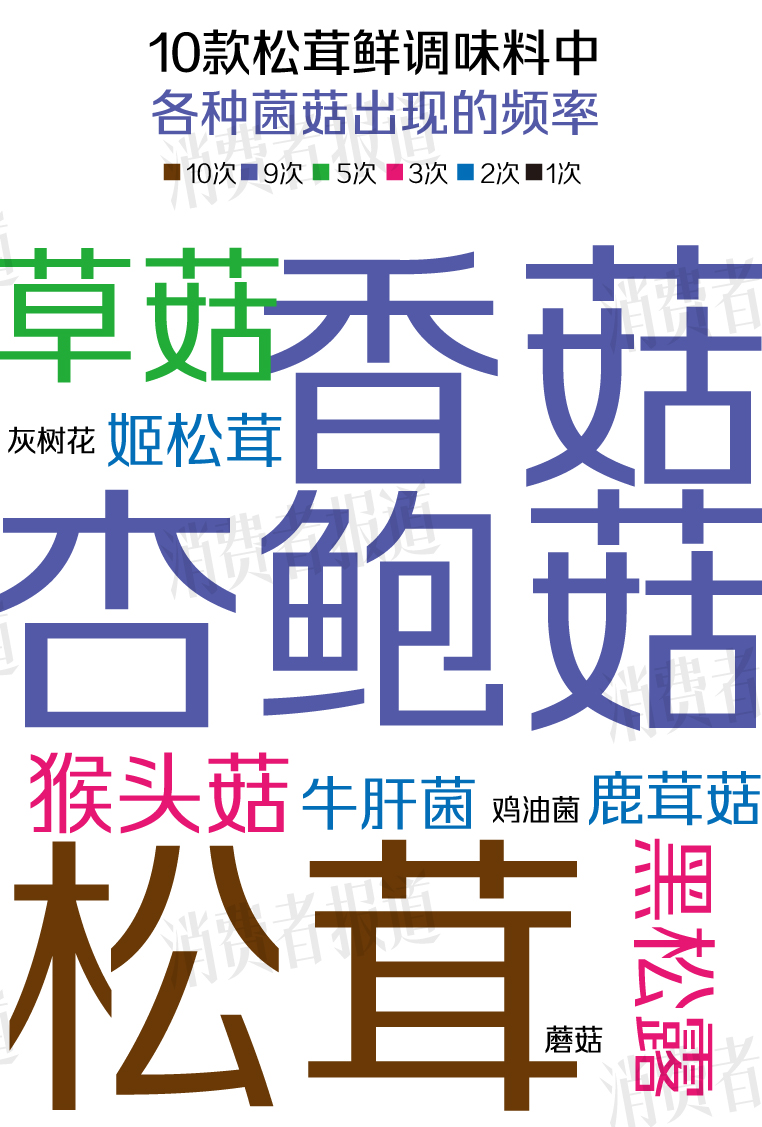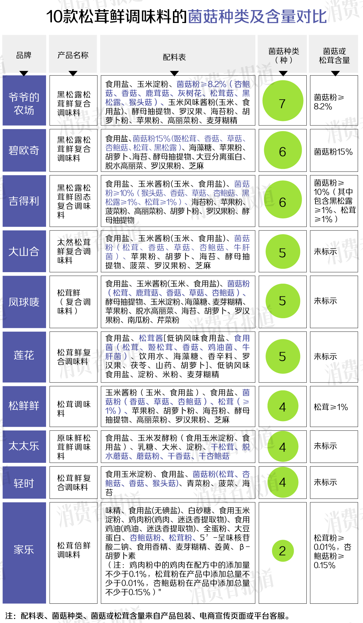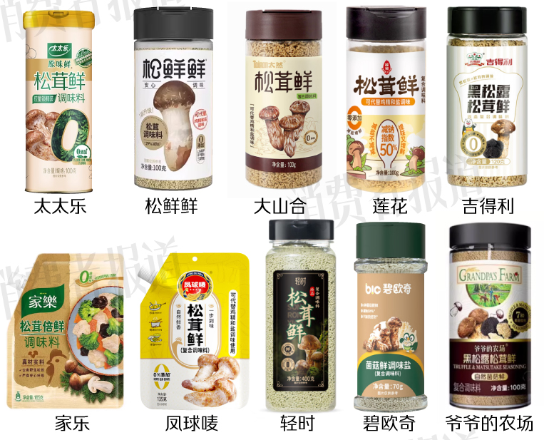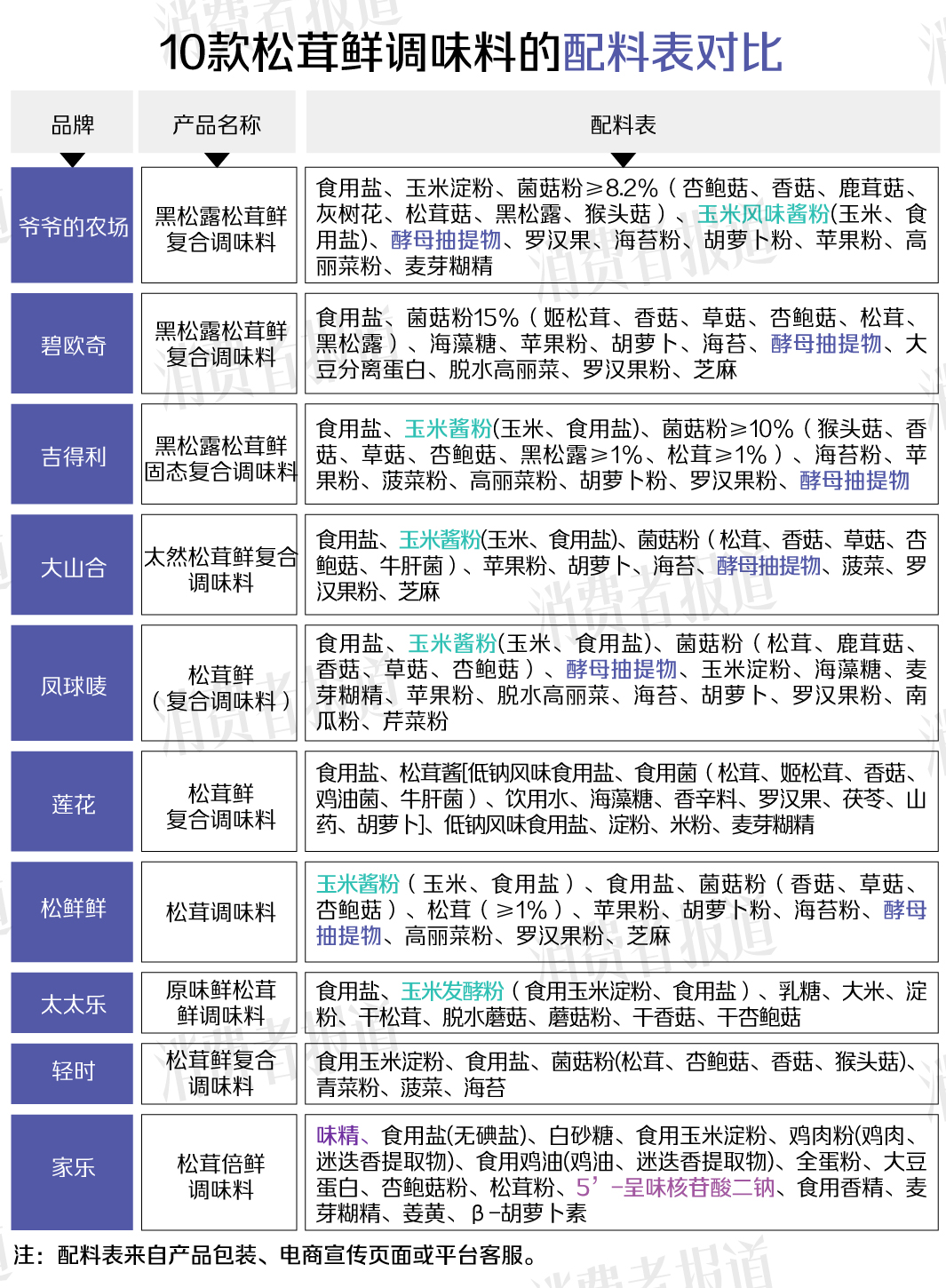 《消费者报道》记者发现,在上述10款松茸鲜调味料中,7款配料表首位是食用盐,1款为玉米酱粉(玉米、食用盐),1款为食用玉米淀粉,1款为味精。