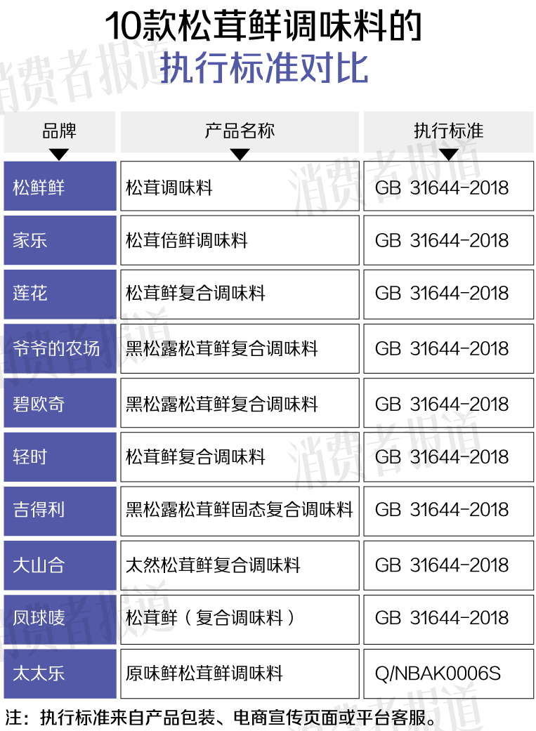 然而,《消费者报道》记者对比市面上主流的10款松茸鲜调味料发现,无一款以该团标作为执行标准。其中,9款产品执行的是《食品安全国家标准 复合调味料》(GB 31644-2018),1款采用企业标准Q/NBAK0006S。
