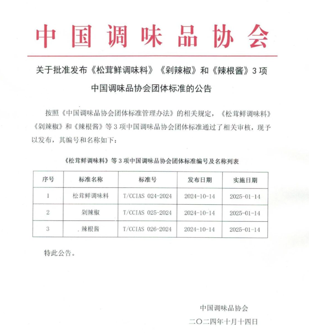 这匹在调味料行业跑出的“黑马”,目前尚无国家标准,仅有团体标准《松茸鲜调味料》(T/CCIAS 024-2024)。该标准由中国调味品协会于2024年10月14日发布,2025年1月14日起实施,但目前为“不公开”状态,消费者如需获取完整标准文本,须付费购买。