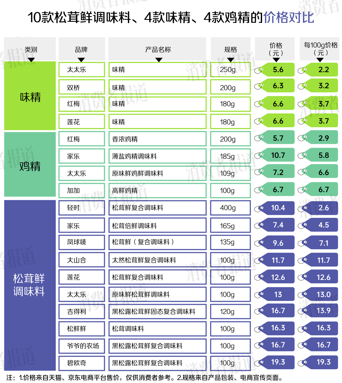 为比较松茸鲜调味料与传统增鲜调味料(味精、鸡精)的价格差异,《消费者报道》选取了4款味精、4款鸡精与10款松茸鲜调味料进行对比。
