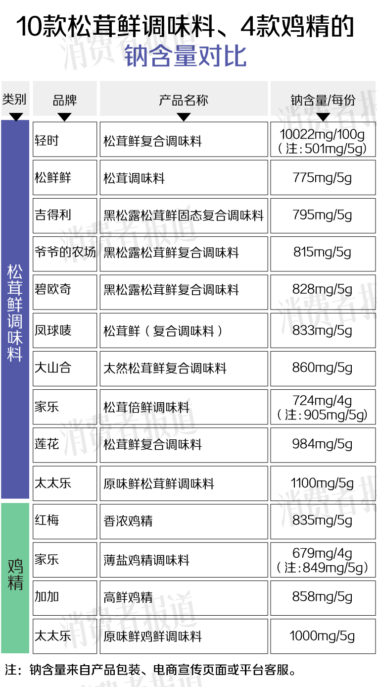 此外,部分松茸鲜调味料的钠含量甚至高于鸡精。以同一品牌为例,太太乐原味鲜松茸鲜调味料(1100mg/5g)的钠含量比太太乐原味鲜鸡鲜调味料(1000mg/5g)高出10%。