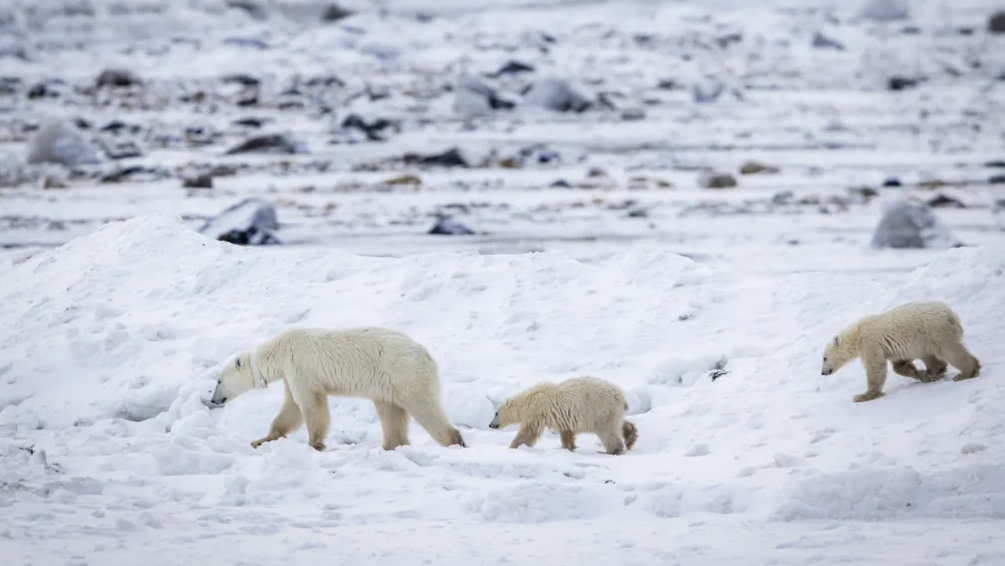 研究人员拍摄的视频显示,两只幼崽在白雪覆盖的荒原中探索,母熊在附近来回踱步,其中一段画面捕捉到一只幼崽匆忙赶往同伴身边的景象。
