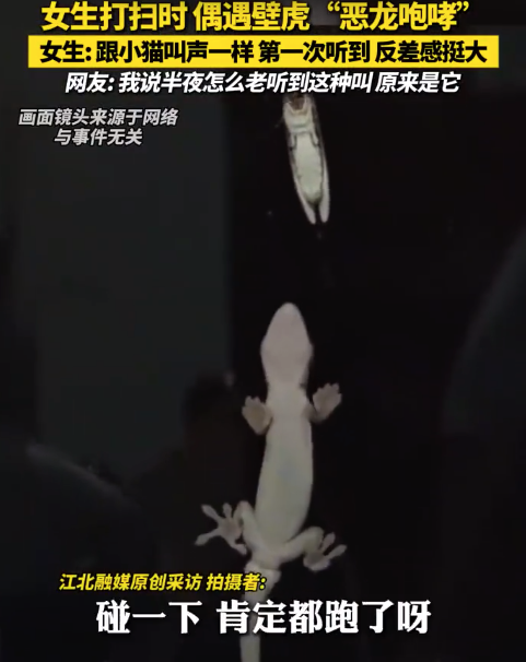 12月18日发布,河南。女生打扫时偶遇壁虎“恶龙咆哮”,女生:“它的叫声跟小猫叫声一样,第一次听到,反差感挺大。没有逃跑断尾,想着壁虎是益虫,就放任它继续呆在我家。”网友:我说半夜怎么老听到这种叫声,原来是它。