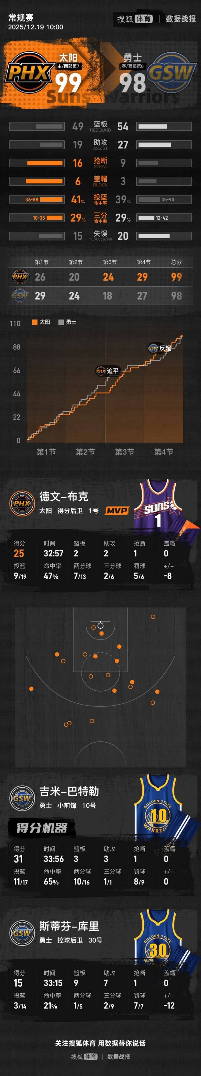 太阳罚球绝杀勇士 布克25分助胜。北京时间12月19日,NBA常规赛中,太阳队主场以99-98险胜勇士队,后者遭遇三连败。布克为太阳贡献了25分、2个篮板和2次助攻,巴特勒则为勇士拿下了31分、3个篮板和3次助攻。