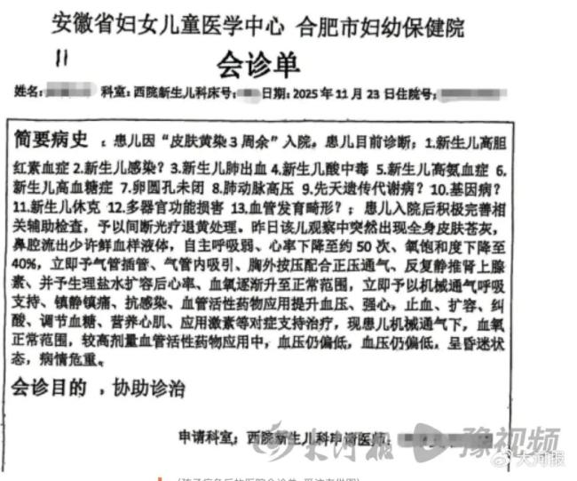 孩子于2025年10月27日在合肥市妇幼保健院西区剖宫产出生,因黄疸未退,于11月20日到该院新生儿科住院接受蓝光治疗。由于新生儿科实行封闭管理,家属无法陪护,仅每周一、三、五通过电话了解孩子的情况。21日,医院告知孩子一切正常,黄疸值虽有反弹但无需担忧。然而,22日下午6点40分许,家属突然接到医院的病危通知,称孩子突发肺出血,正在抢救。