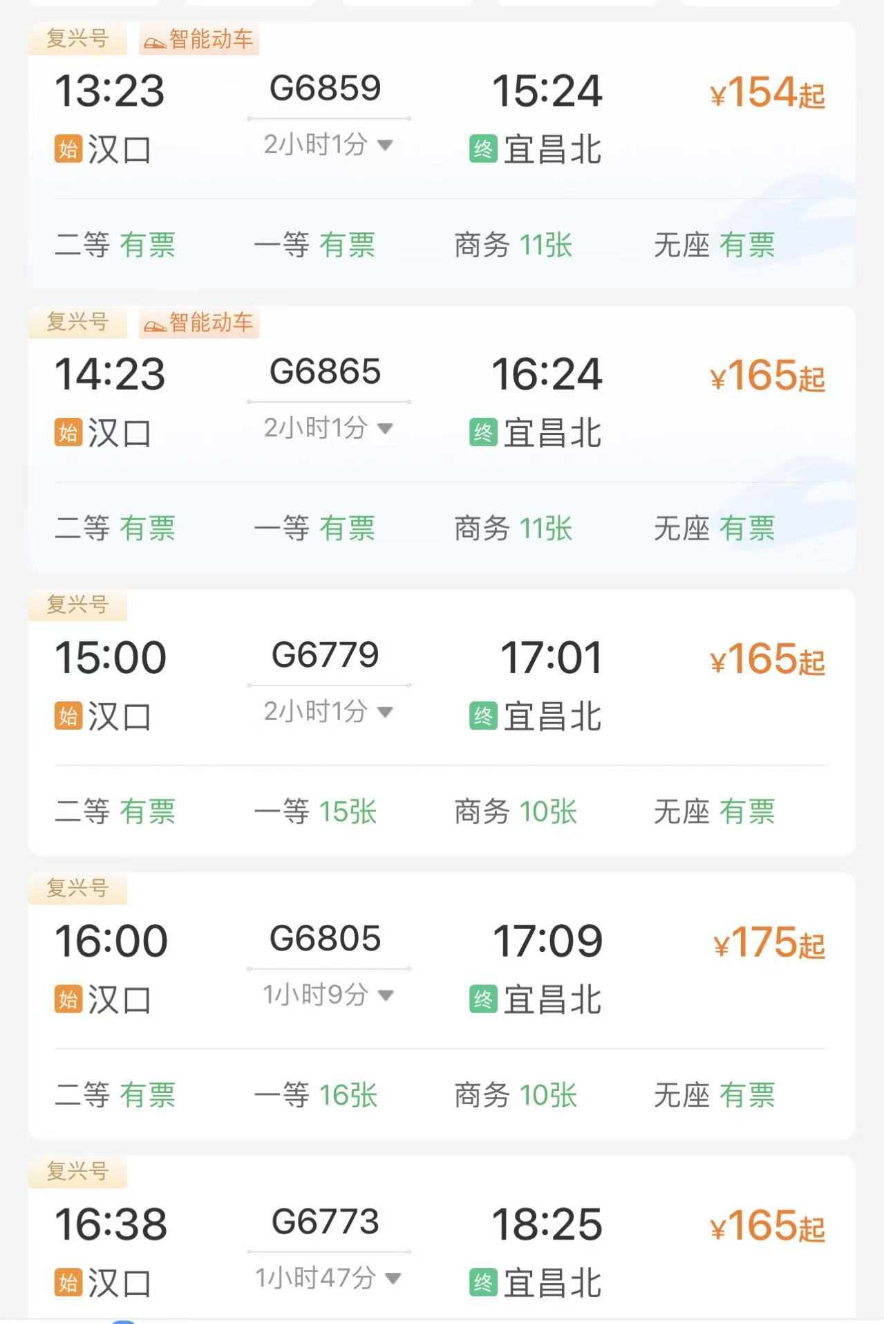 极目新闻记者在12306上看到,宜昌北到汉口站首发车二等座票价为折后175元,一等座为折后281元,所需时间为1小时9分。