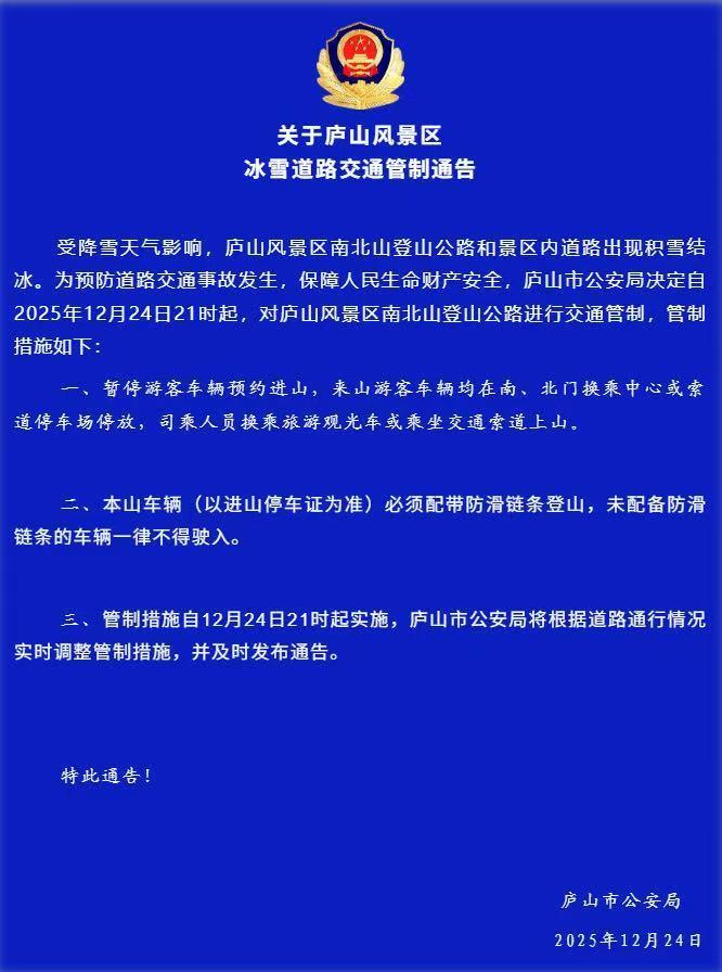 记者注意到,24日晚上9时许,庐山市公安局发布《关于庐山风景区冰雪道路交通管制通告》。该通告称,暂停游客车辆预约进山。