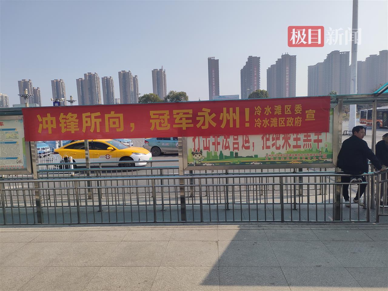 在永州火车站出口处,一出站就可以看见电子显示屏上滚动着“永州队,湘超冠军”“冲锋所向,冠军永州”的宣传语。在火车站广场上,永州市冷水滩区政府也挂出了“冲锋所向,冠军永州”的红色横幅。