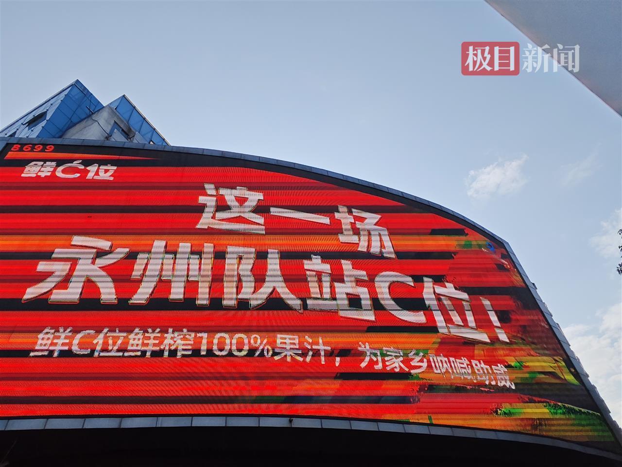 在永州双洲路与湘永路路口,极目新闻记者看到,一块电子显示屏上不断显示着“冠军之城永州欢迎您”“赣州永州一家亲,我们一起夺冠军”“这一场,永州队站C位”等庆祝宣传词。在永州万达广场内的电子显示屏上,也换上了“永州队,湘超冠军”“热烈祝贺永州队勇夺湘超冠军”“湘超冠军城,永州欢迎您”“冲锋所向,冠军永州”等庆祝永州队夺冠的话语。
