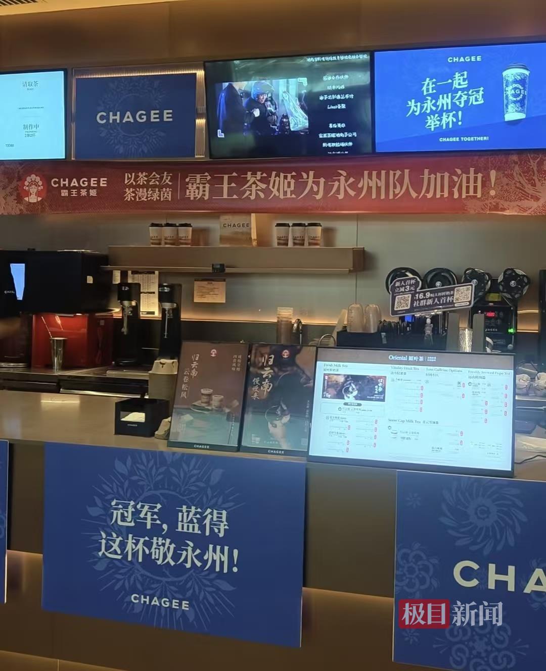 记者在永州街头走访了解到,为庆祝永州夺冠,当地的霸王茶姬奶茶店也推出了特别免单优惠,顾客只要在规定时间段到店对店员喊出对应口令,扫码就可兑换一杯奶茶。霸王茶姬永州万达店的一名工作人员介绍,27日晚上送出了一百多杯,28日晚上7点到10点预计还要送出1000杯。
