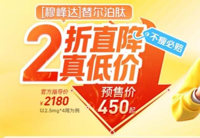 礼来的替尔泊肽虽未公开降价,但在电商平台也出现了预售促销,醒目标注“2折直降”:2.4ml:10mg/支、2.4ml:20mg/支的替尔泊肽售价分别为450元、750元,其中2.4ml:10mg/支标注“官方指导价2180元”。