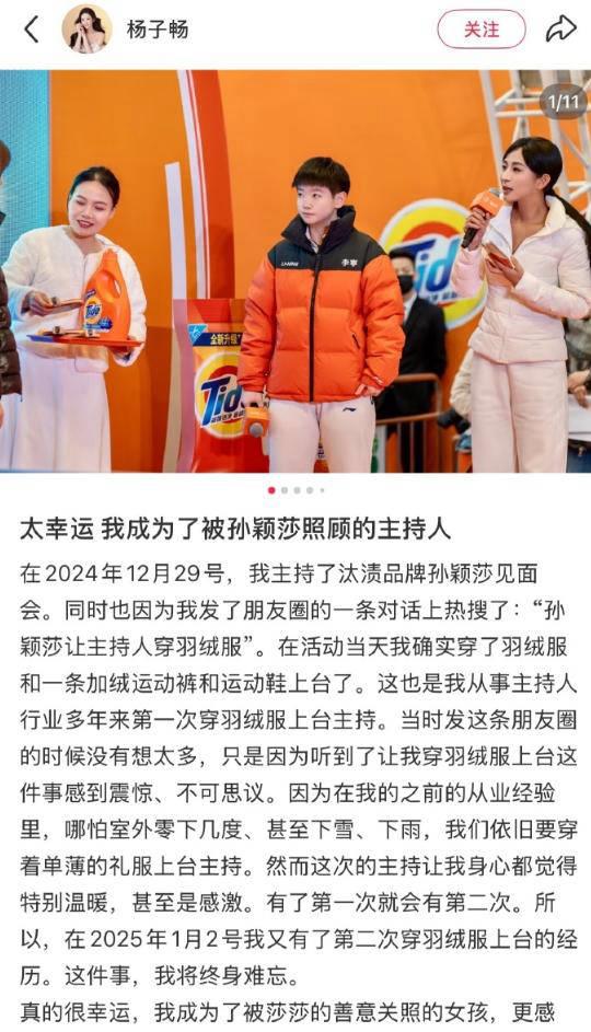 很多网友都在感慨:“孙颖莎的含金量仍在上升。”为什么这么说?因为,在2024年底的一次寒风凛凛的户外活动中,孙颖莎眼见女主持人杨子畅即将身穿单薄礼服登台,关切地说“希望主持人能穿上羽绒服”。之后,杨子畅专门发视频感谢孙颖莎:“这也是我第一次穿羽绒服上台,身心都很暖。”