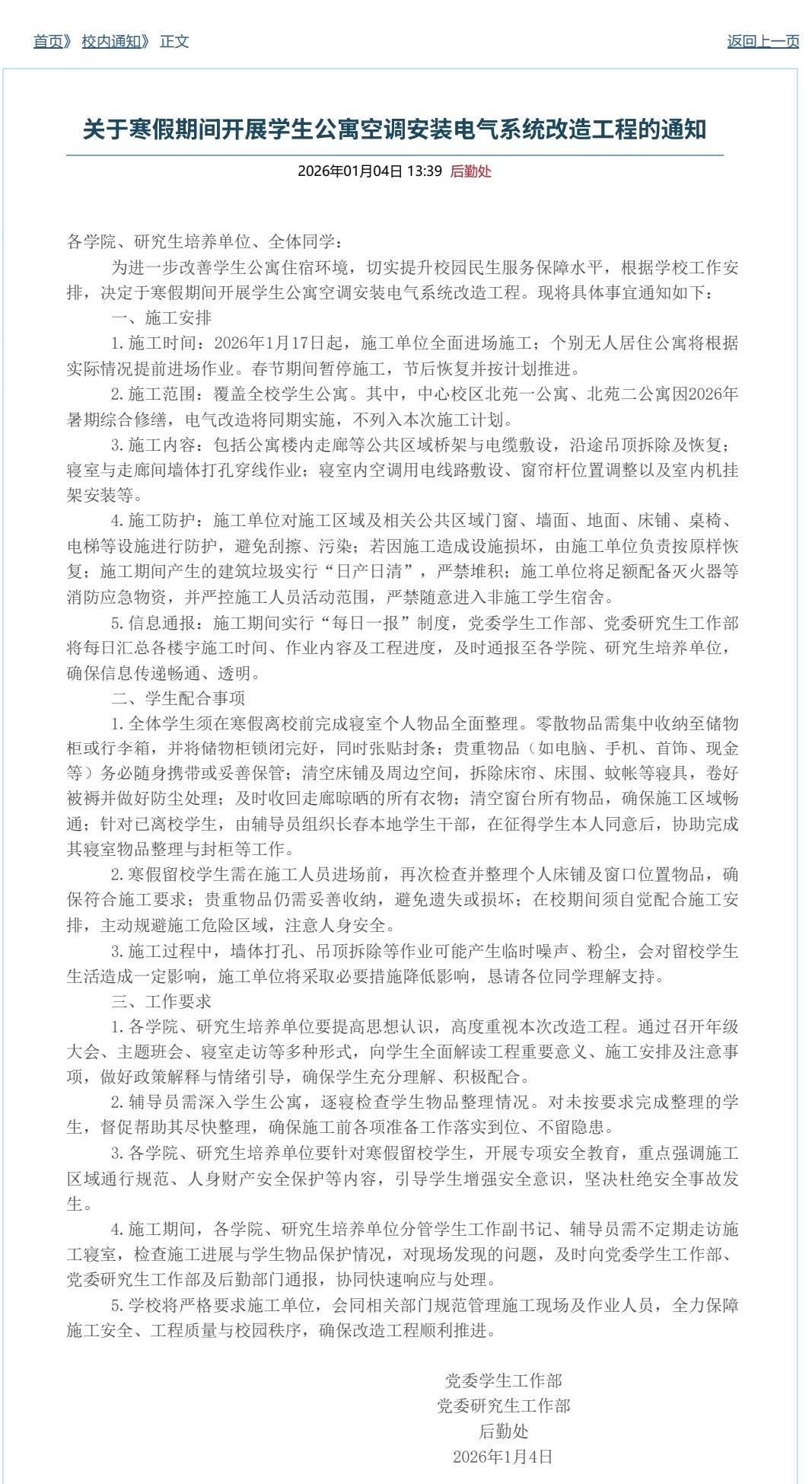 通知内容显示,根据学校工作安排,决定于寒假期间开展学生公寓空调安装电气系统改造工程。2026年1月17日起,施工单位全面进场施工;个别无人居住公寓将根据实际情况提前进场作业。春节期间暂停施工,节后恢复并按计划推进。施工范围覆盖全校学生公寓,其中,中心校区北苑一公寓、北苑二公寓因2026年暑期综合修缮,电气改造将同期实施,不列入本次施工计划。施工内容包括公寓楼内走廊等公共区域桥架与电缆敷设,沿途吊顶拆除及恢复;寝室与走廊间墙体打孔穿线作业等。
