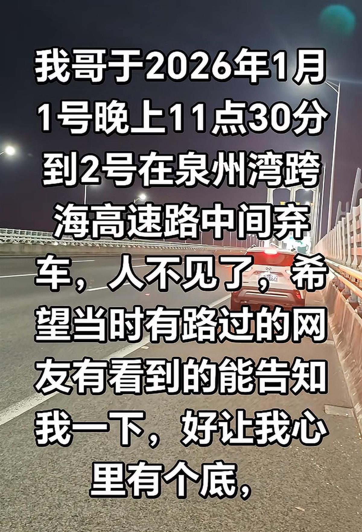 1月4日,有网友在社交平台发布紧急求助信息,称其哥哥于1月1日晚11时许,在福建泉州湾跨海大桥的应急车道弃车后失踪。车辆当时打着双闪,车内物品并无丢失,唯独人不见了踪影。家属恳请当晚途经此处的目击者提供线索。