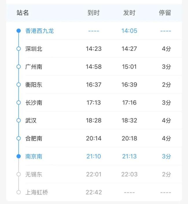票价会根据实际情况进行动态调整。目前,从南京前往香港的去程高铁班次尚未上线,预计将在明日全国铁路实施新一季度列车运行图后开通。这趟高铁将由上海虹桥站始发,途经南京南站,最终抵达香港西九龙站。