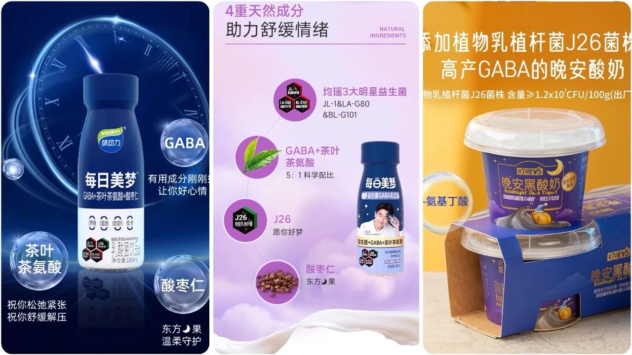 味动力(均瑶)分别于去年1月、5月推出每日美梦乳酸菌饮品、每日美梦益生菌GABA乳饮品,两款产品均聚焦夜晚助眠生活场景,均添加了GABA、茶叶茶氨酸以及助力GABA增产的J26植物乳杆菌。10月,叮咚V5(叮咚买菜)上市晚安黑酸奶,宣称“选用高产γ-氨基丁酸(GABA)的植物乳杆菌J26菌株”。