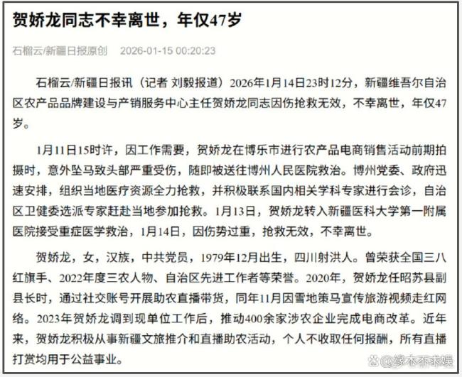 不少网友对她的离世感到恍惚和不舍,因为她不仅是一个很好的人,也是一位称职的领导。贺娇龙是四川射洪人,从基层做起,担任过昭苏县多个职务。2017年任昭苏县副县长,2021年升任伊犁州文旅局副局长。她身披红斗篷在雪地策马为昭苏旅游代言,因此走红网络。