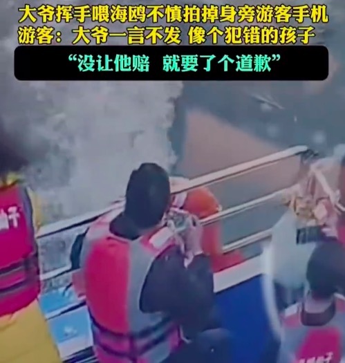 近日,湖北襄阳,一大爷挥手喂海鸥不慎拍掉身旁游客手机沙先生手机,沙先生:大爷有七八十岁吧,从头到尾一言不发,像个犯错的孩子一样,让人看了心疼,“我说我不追究他责任,没让他赔,就要了个道歉,这个事就解决了。”