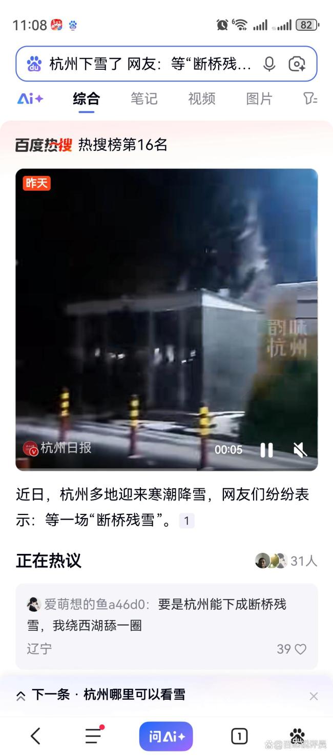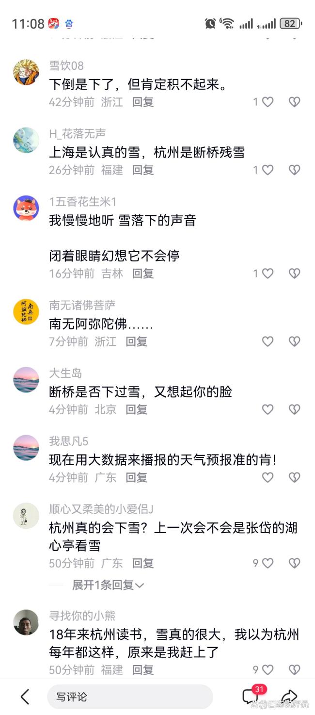 全杭州都赶来看断桥残雪了吗 首场降雪引全民打卡。2026年1月20日,杭州迎来今冬首场大范围降雪。这场降雪由北方强寒潮与西南暖湿气流交汇形成,市区以雨夹雪为主,临安太子尖、龙王山等山区出现中到大雪,积雪深度达5-21厘米。银装素裹的景致点燃了市民与游客的赏雪热情。
