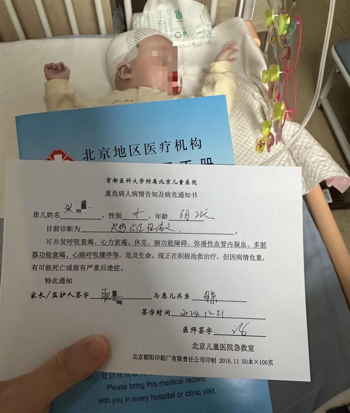 让耿女士没想到的是,2024年12月时她的小女儿被医院诊断出了小脑肿瘤,她赶紧将小女儿送到首都医科大学附属北京儿童医院治疗。据耿女士提供的首都医科大学附属北京儿童医院重危病人病情告知及病危通知书显示,她6个月大的女儿被诊断为颅内肿瘤,可并发呼吸衰竭、心力衰竭、休克、脑功能障碍、弥漫性血管内凝血、多脏器功能衰竭、心跳呼吸骤停等,危及生命,医师签字时间为2024年12月21日。由于医生明确告知称,病情危急,抢救希望不大,因此耿女士连夜将女儿转院到了复旦大学附属儿科医院。