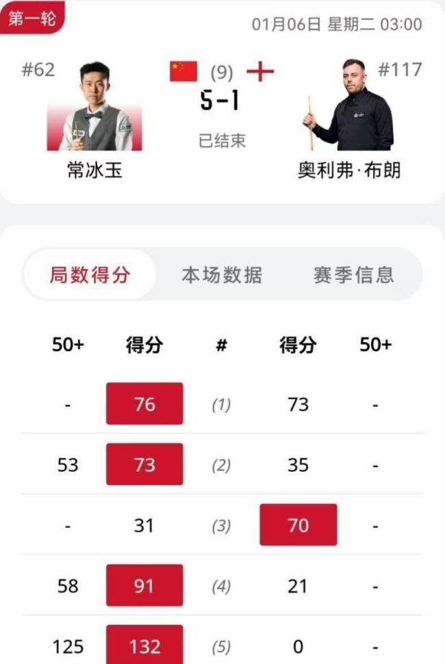 常冰玉与奥利弗·布朗的比赛同样呈现一边倒态势。首局常冰玉险胜,随后连赢三局,带着3-1的优势进入休息时间。第五局常冰玉轰出单杆125分零封对手,第六局再打单杆57分锁定胜局,以5-1轻松晋级96强。