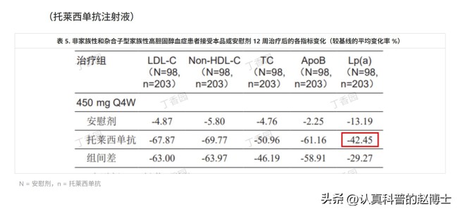 这项研究显示,在原有降脂治疗基础之上,按照“450mg/次、每4周皮下注射一次”的剂量增加“托莱西单抗”,连续治疗12周以后,可以观察到42.45%的【脂蛋白(a)】水平下降。