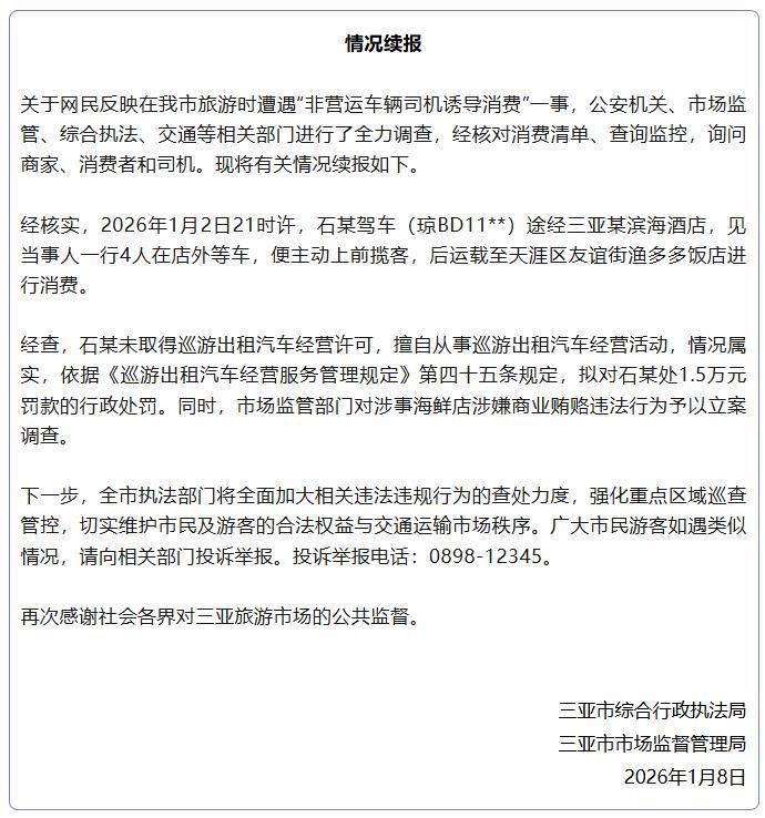 1月7日,三亚市市场监督管理局发布情况通报,称已联合交通等相关部门介入调查,如查实存在违法违规行为,将依法从严处理,绝不姑息。