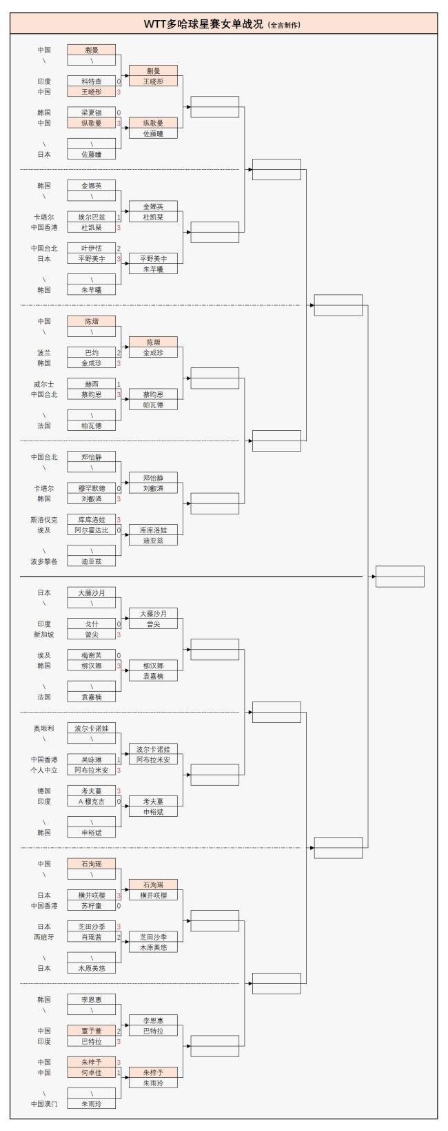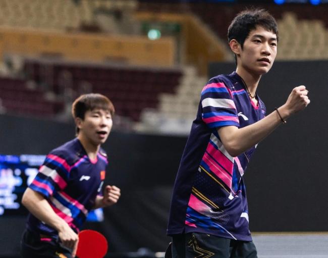 - 蒯曼/陈熠3-1申裕斌/朱芊曦(韩国):12-10、11-9、3-11、11-9 - 石洵瑶/王晓彤3-0梅谢芙(埃及)/博嘉德(瑞典):11-8、11-6、11-9 - 覃予萱/纵歌曼3-0艾雅/埃尔巴兹(卡塔尔):11-2、11-2、11-1