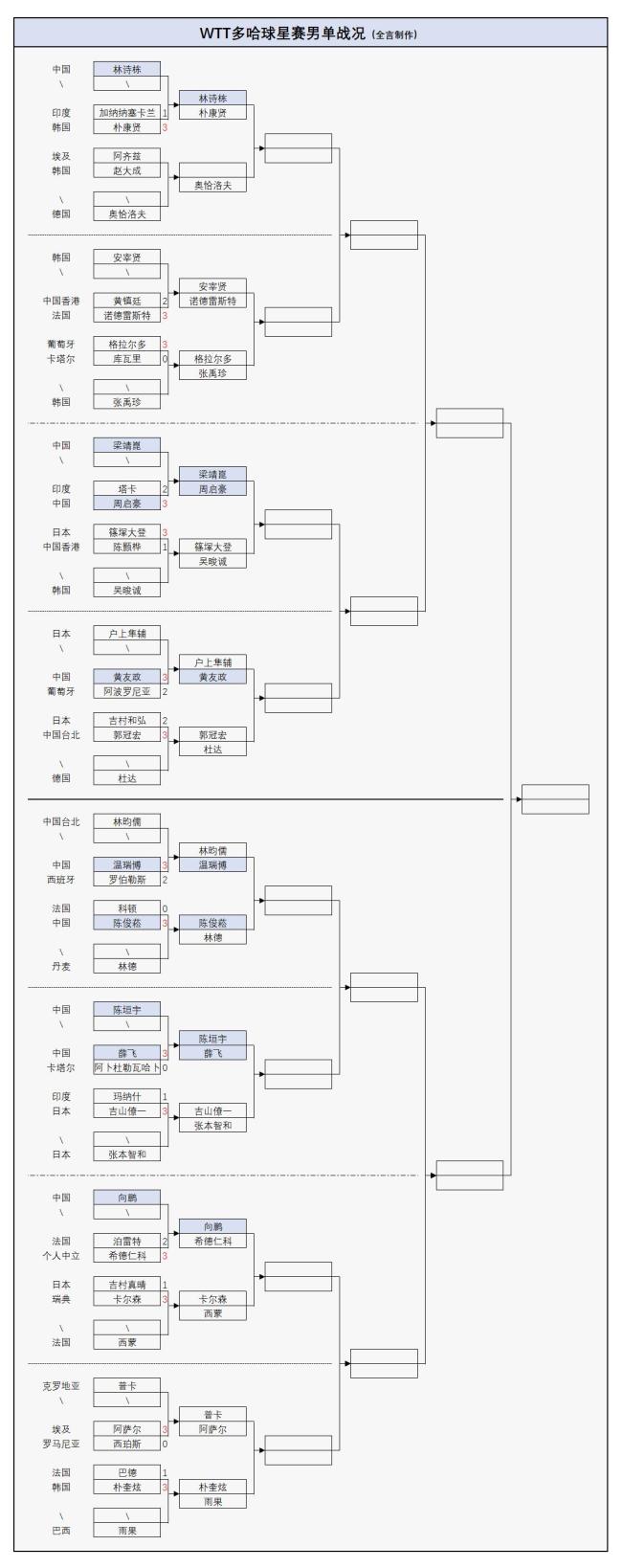 - 周启豪3-2塔卡(印度):8-11、5-11、11-6、11-9、11-5 - 黄友政3-2阿波罗尼亚(葡萄牙):6-11、7-11、11-8、11-5、11-9 - 温瑞博3-2罗伯勒斯(西班牙):11-13、6-11、11-7、11-7、11-5 - 陈俊菘3-0科顿(法国):15-13、13-11、11-9 - 薛飞3-0阿卜杜勒瓦哈卜(卡塔尔):14-12、11-5、11-6