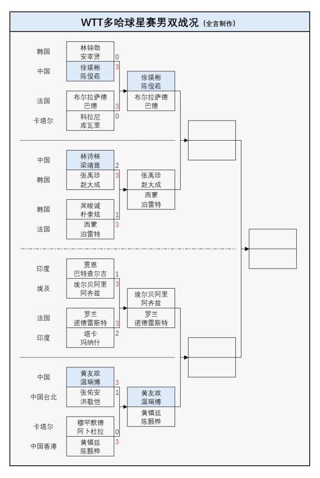 - 徐瑛彬/陈俊菘3-0林钟勋/安宰贤(韩国):11-8、16-14、11-9 - 黄友政/温瑞博3-1张佑安/洪敬恺(中国台北):11-5、5-11、11-4、11-8 - 林诗栋/梁靖崑2-3张禹珍/赵大成(韩国):9-11、11-9、6-11、11-7、9-11