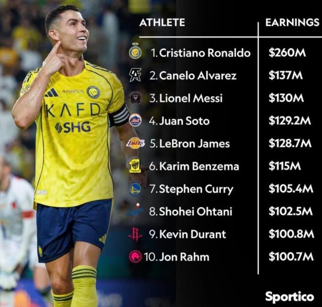 C罗能够连续三年霸榜主要得益于至少2亿美元的固定税后年薪。即使不算商业收入,他也足以稳居第一。但如果只看商业收入,C罗的6000万美元只能排在第四位。相比之下,梅西的商业收入为7000万美元,勒布朗·詹姆斯为8000万美元,而洛杉矶道奇队的日本巨星大谷翔平则以1亿美元高居榜首。这表明,巨星们的商业价值更能体现他们的市场影响力。