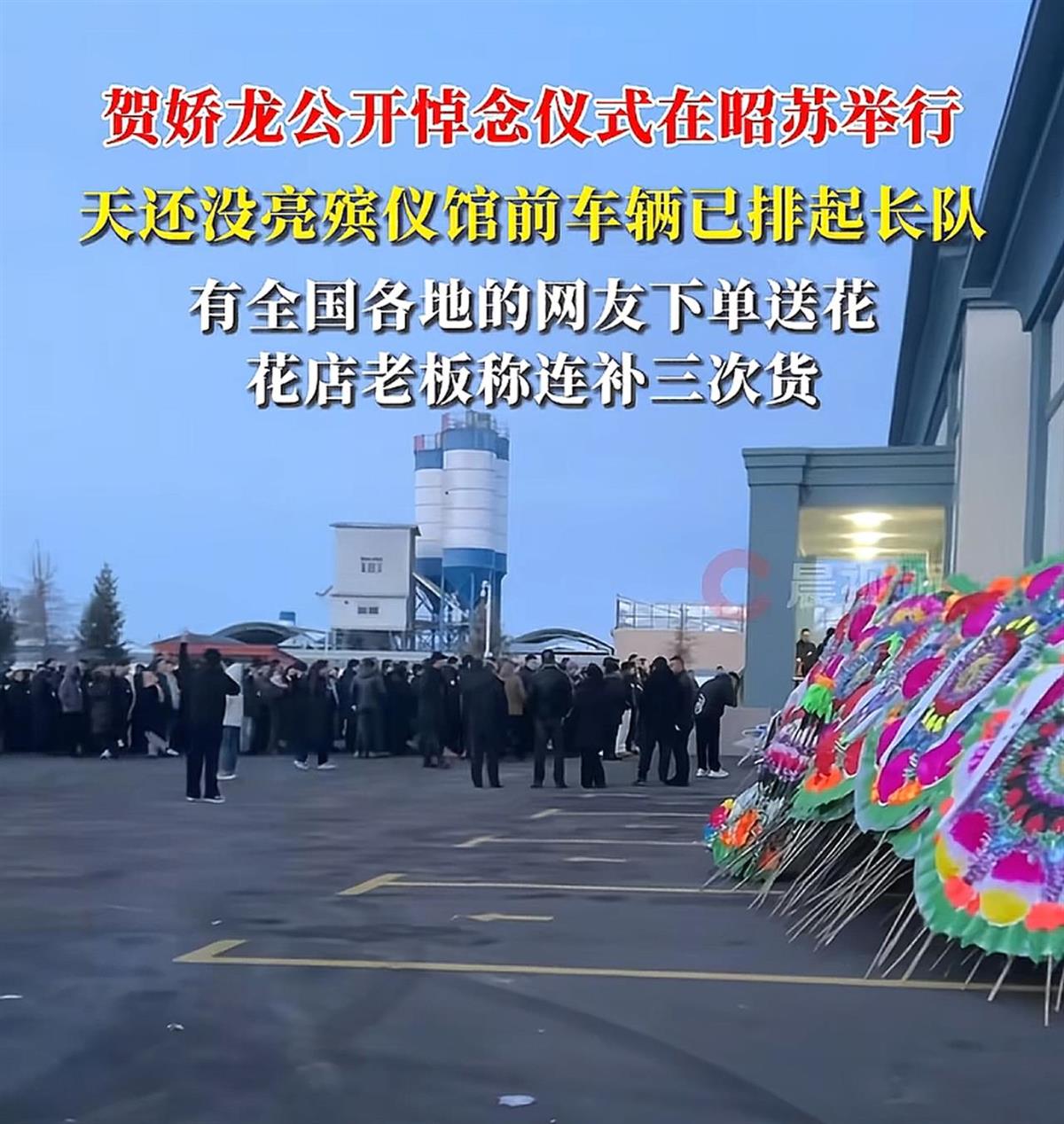 2026年1月14日,新疆维吾尔自治区农产品品牌建设与产销服务中心主任贺娇龙同志因伤抢救无效,不幸离世,年仅47岁。16日上午,大量民众前往昭苏殡仪馆送别贺娇龙。有当地花店老板告诉极目新闻记者,15日已经有网友预订鲜花送至殡仪馆,目前鲜花已全部售罄,正在从外地补货。多名已经前往殡仪馆吊唁的网友向记者表示,现场来了全国各地的民众,停满了车辆,殡仪馆内已放满鲜花。