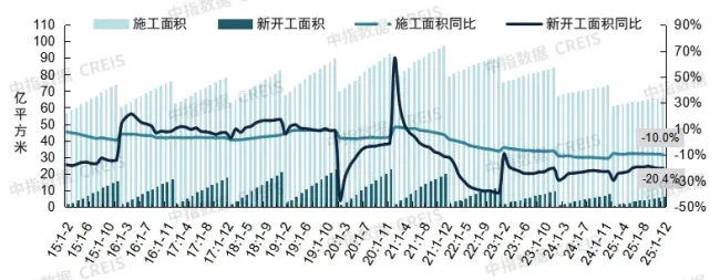 新开工修复的先决条件仍是市场销售的企稳。2025年受新房销售回落、过去两年土地成交显著缩量等因素影响,全国房屋新开工面积延续下行态势。截至2025年12月,全国商品房待售面积达7.66亿平方米,同比增长1.6%。作为新开工的先行指标,2025年土地成交面积仍延续缩量态势,全国土地(住宅+商办用地)成交面积同比下降12.4%。